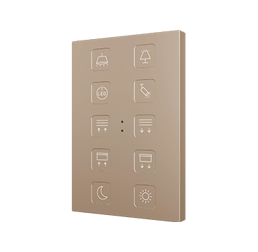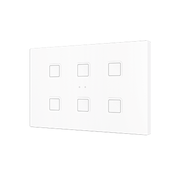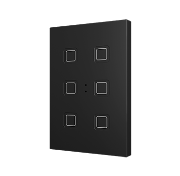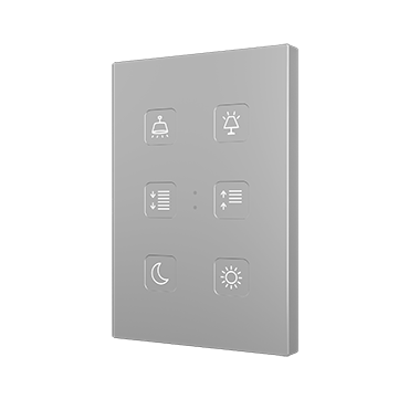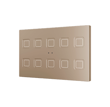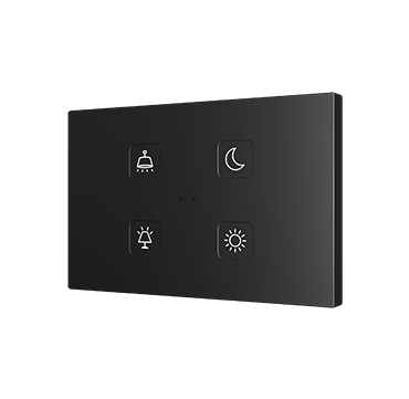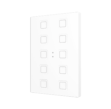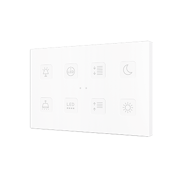 Pulsadores capacitivos de policarbonato con iconos retroiluminados personalizables. Existen modelos de 4, 6, 8 y 10 botones con funciones configurables e iconos retroiluminados, los cuales regulan su brillo con el sensor de luminosidad ambiente y se atenúan cuando el usuario no es detectado por el sensor de proximidad. Incorpora un termostato y sonda de temperatura interna. Instalación en caja de mecanismos estándar europea, italiana, australiana o americana.