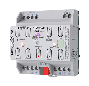 Regulador en carril DIN de 4 canales PWM de tensión constante para cargas LED DC.